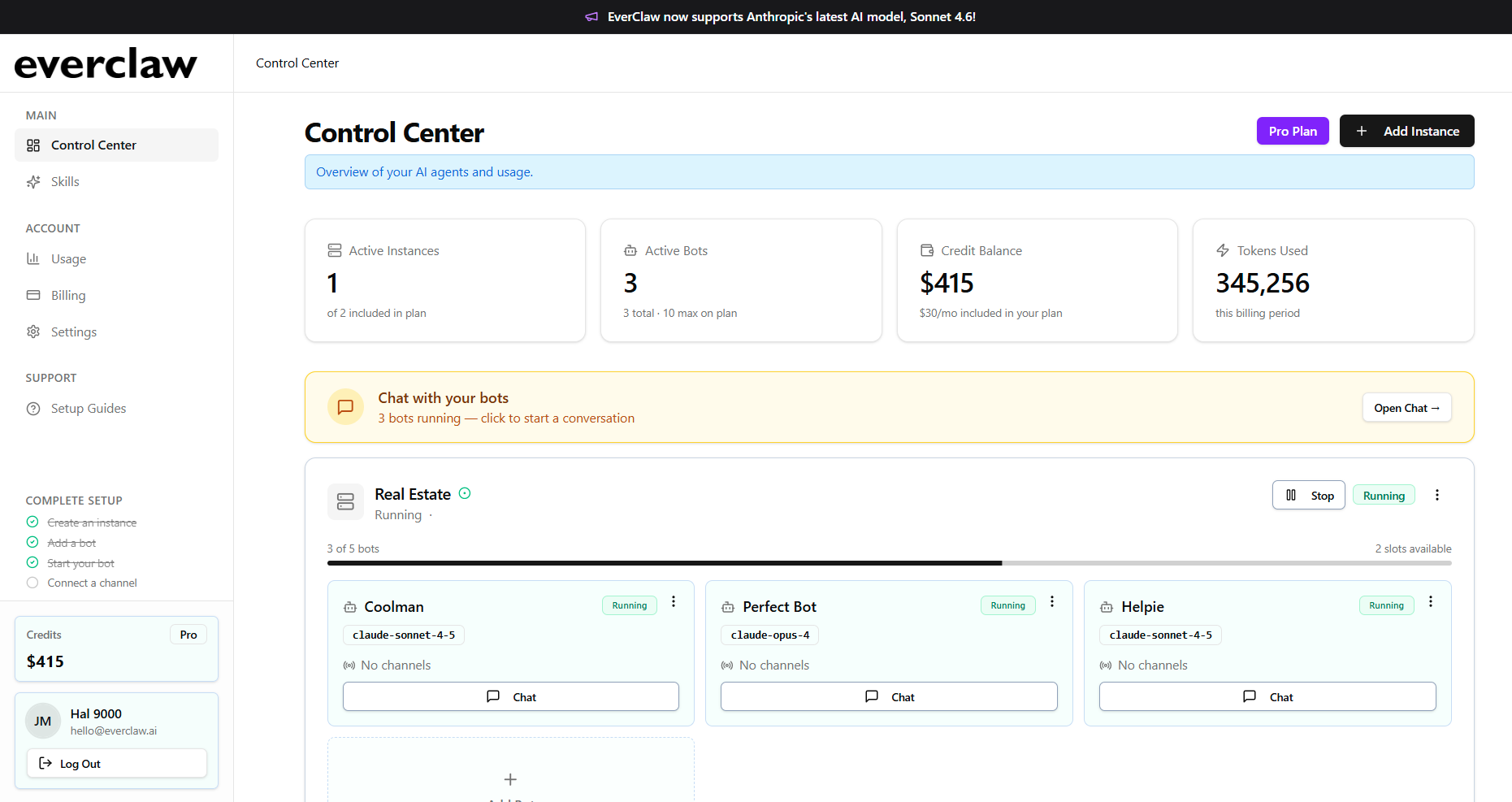 The moment you create your bot, EverClaw gives you a live chat window right in your browser. No WhatsApp number. No Telegram token. No channel setup at all.